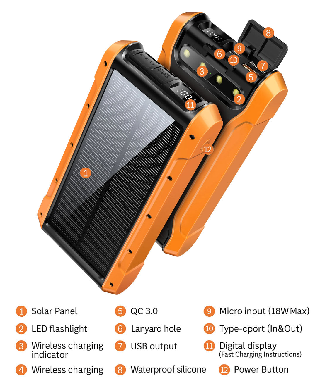 The built-in solar panel provides trickle charging in direct sunlight. It's ideal as a backup power source when you're off-grid.