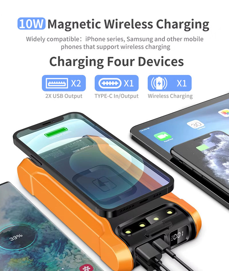 Yes, it features 2 USB outputs, 1 USB-C output, and 10W wireless charging, allowing you to power up to 4 devices simultaneously.
